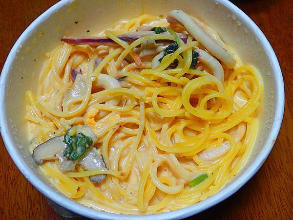 為什麼我的配料沒有跟其它兩份一樣彭湃!?雖然透抽不少、菇菇也很多,奶油醬料像湯汁一樣滿溢,但跟那兩個浮誇的比起來相形失色,誰知道拌開來熱氣騰騰,濃稠的醬汁奶香四溢,也因為醬的濃度保持了外送溫度,更意外的是醬汁竟還有魚卵增加了顆粒口感,海鮮味根本不輸另外兩份以貌取勝的餐點哦~