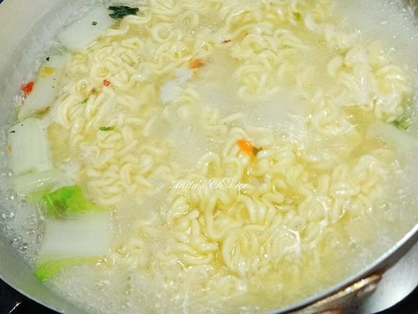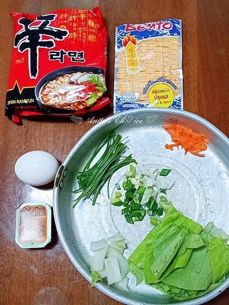 材料:辛拉麵/紅蘿蔔絲/小白菜/蛋/葱/糖醋醬/泰國魷魚片