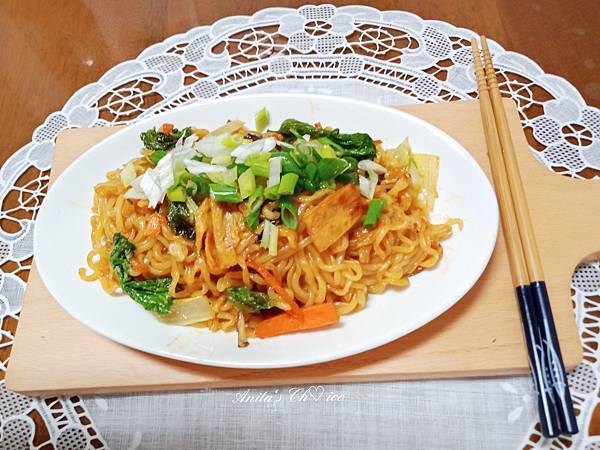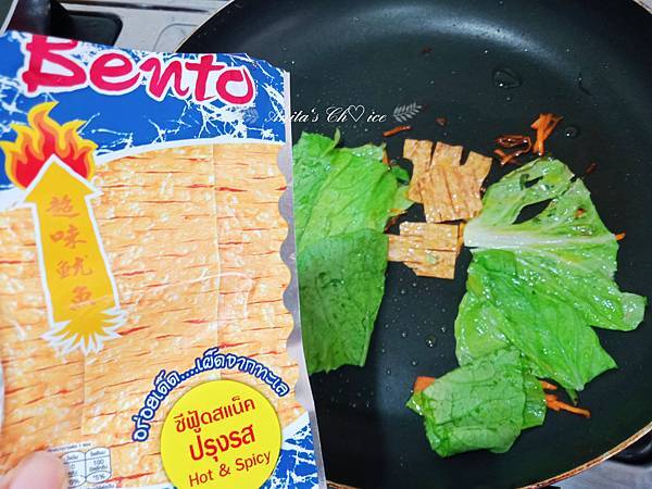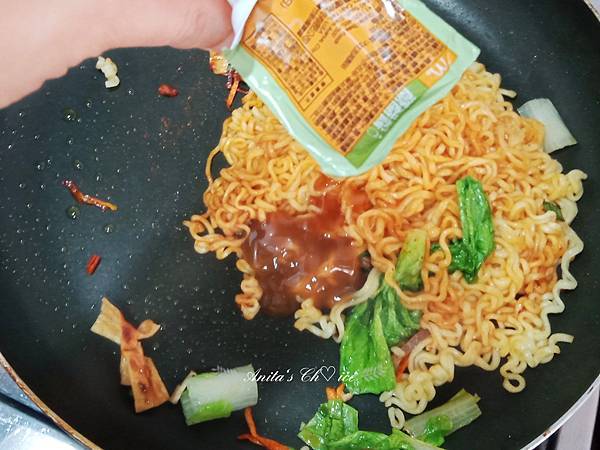比較特別的是因為菜料太素了,就把辣到Anita實在無法承受的這款泰國魷魚片當配菜一起炒,因為甜甜辣辣的,一定跟又甜又醋又辛的炒麵很搭!